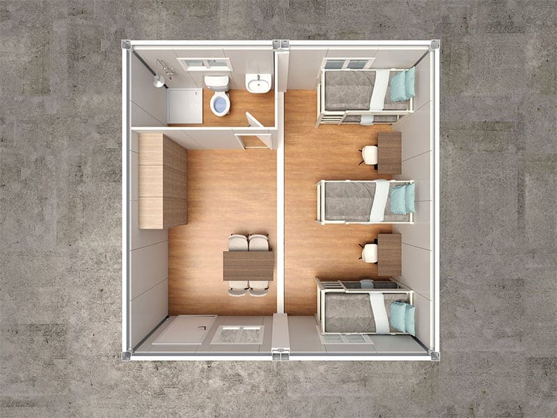 من حيث التصميم الداخلي، يمكن تجهيز كل وحدة حاوية بحمام خاص. يضمن هذا التصميم الخصوصية والراحة، مما يخلق بيئة معيشية مريحة تُشبه المساكن التقليدية. وبدلاً من ذلك، وبحسب الاحتياجات العملية والميزانية، يمكن توفير حمامات مشتركة في المناطق العامة، مما يُتيح مرونة في الاستخدام وإدارة التكاليف.