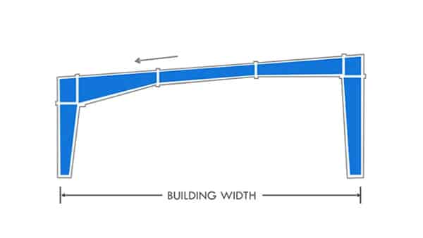 Portal frame structures are divided into two types: clear-span structures without internal columns and multi-span continuous structures with internal columns. The clear span can reach 48 meters. The internal single span of multi-span structures can reach 30 meters. In practical applications, depending on the project requirements, various forms such as single-slope, double-slope, multi-slope, and unequal span foundations can be adopted. Additionally, cranes can be integrated.